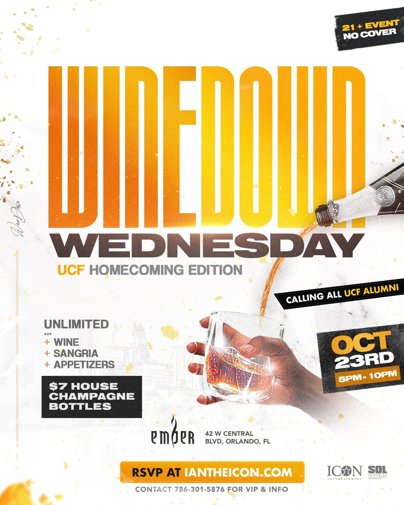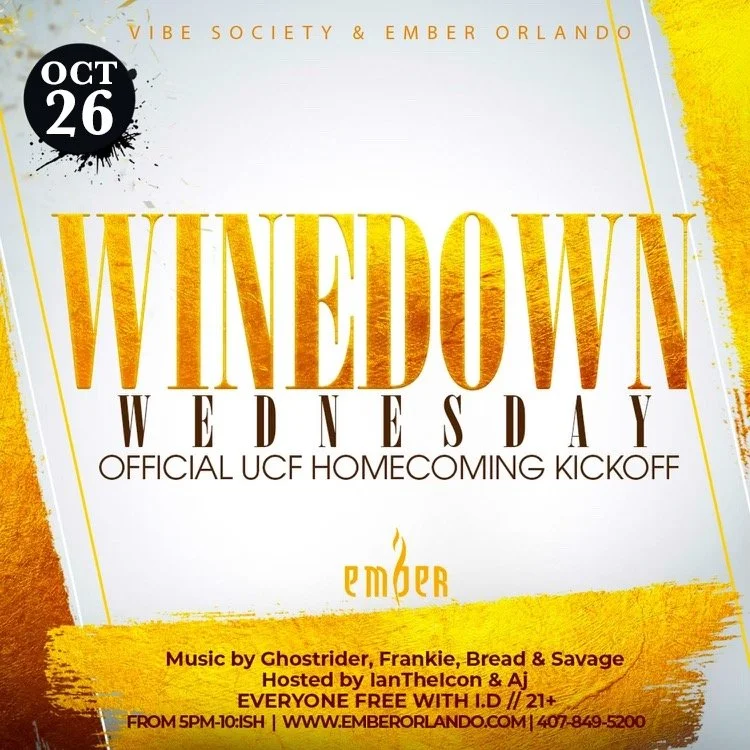 Wine Down Wednesday is a weekly happy hour event filled with a night of dancing and celebrating with wine, house-made sangria, champagne, and appetizers. Join fellow socially active young professionals for an unforgettable experience at this special edition for UCF Homecoming 2024.